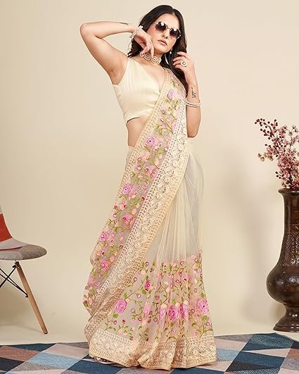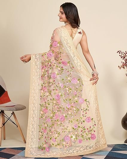 VAIRAGE Women’s Beautiful Soft Net Embroidery Saree With Unstitched Blouse 6079