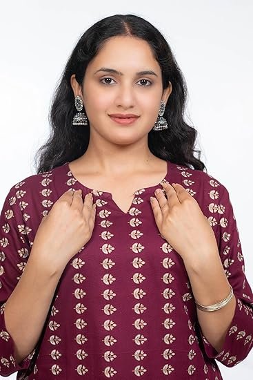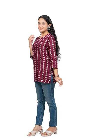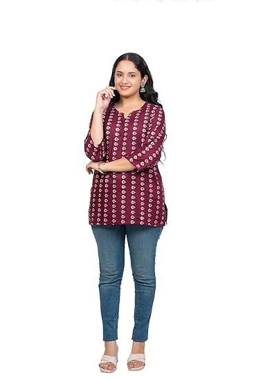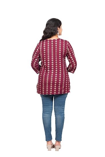 Women’s Cotton Short Kurti, Burgundy with Traditional Print, 3/4 Sleeve